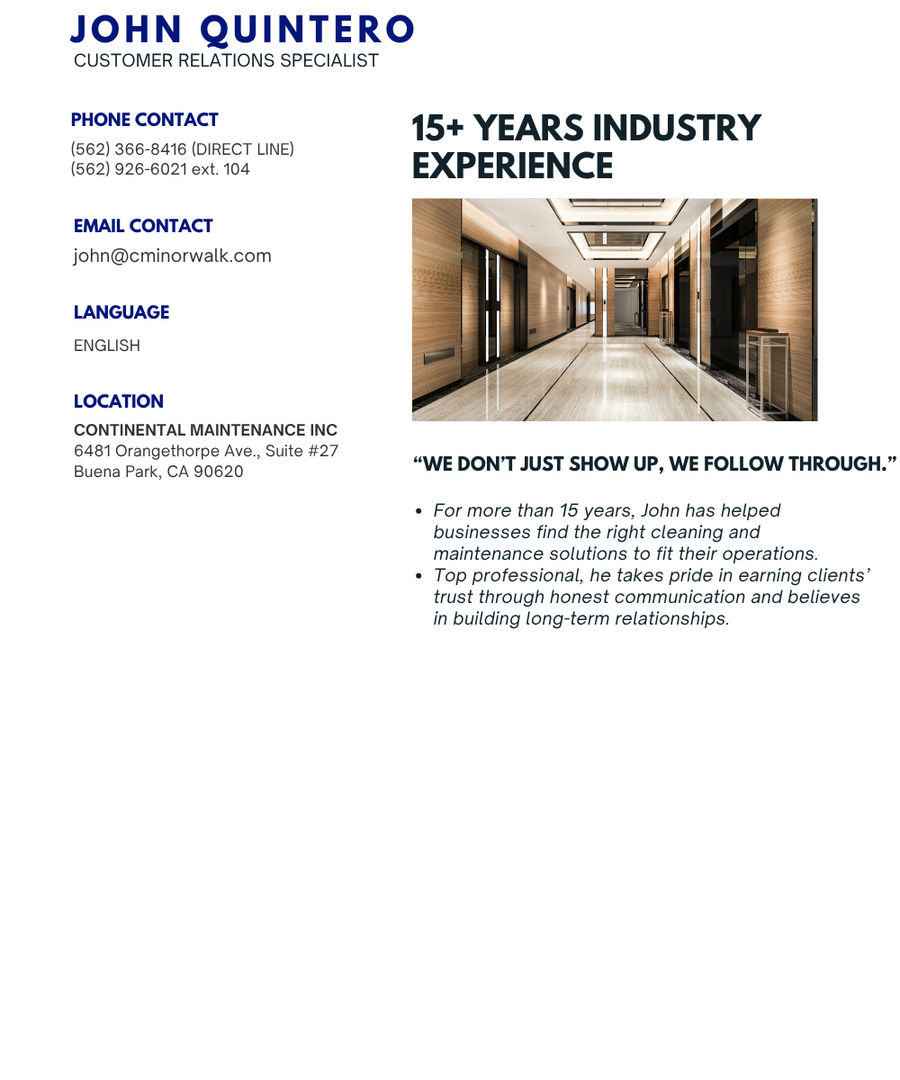 Our team is made up of dedicated and loyal individuals who bring years of experience, attention to detail, and a shared commitment to excellence. From field technicians to supervisors & project managers, every member plays a vital role in delivering consistent, high-quality service our clients can rely on. We take pride in our professionalism, reliability, and the lasting relationships we build with every business we serve.